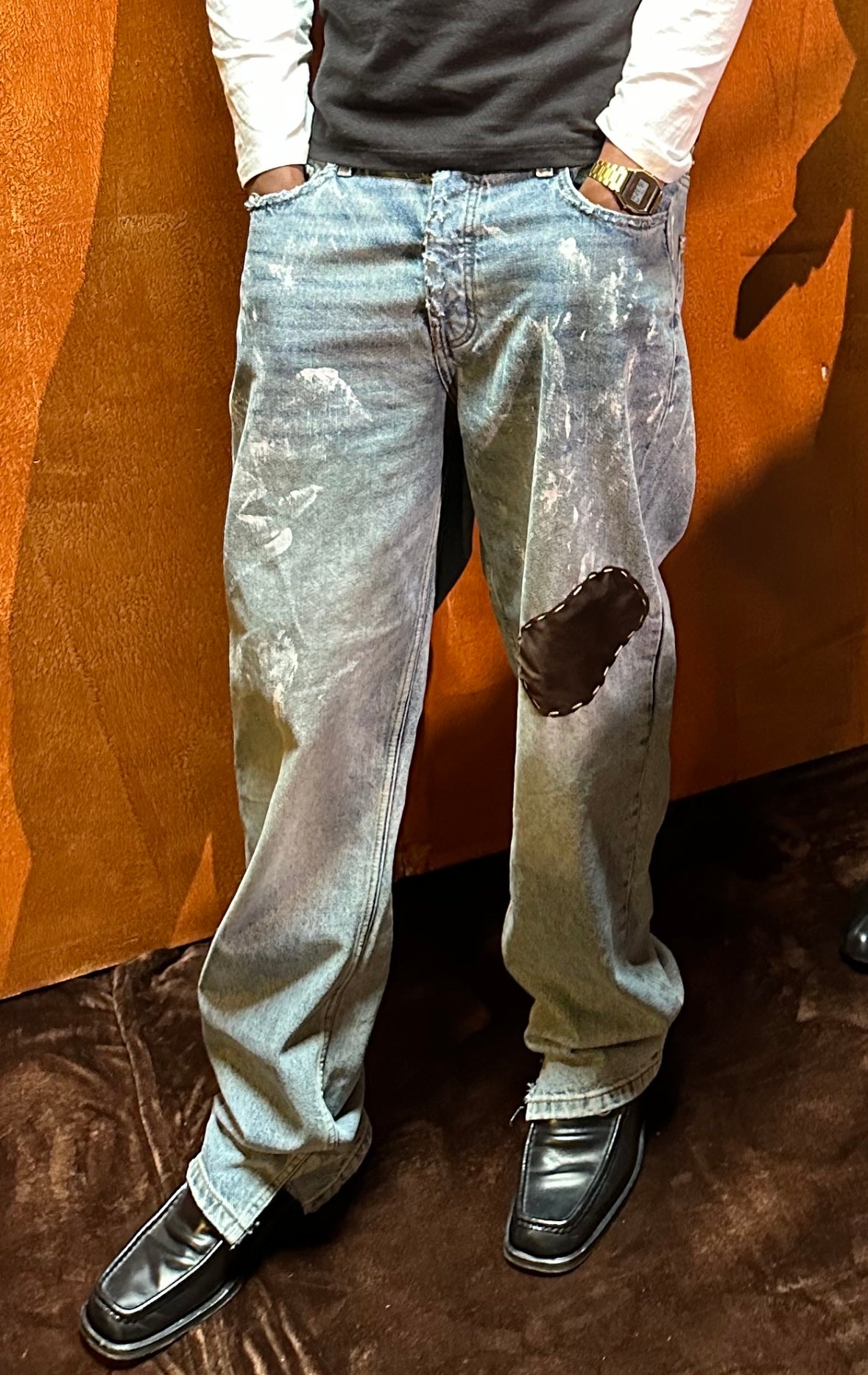 - Hand stitched misplaced velvet patch on left leg